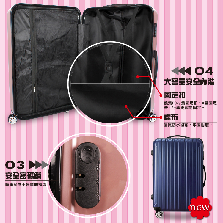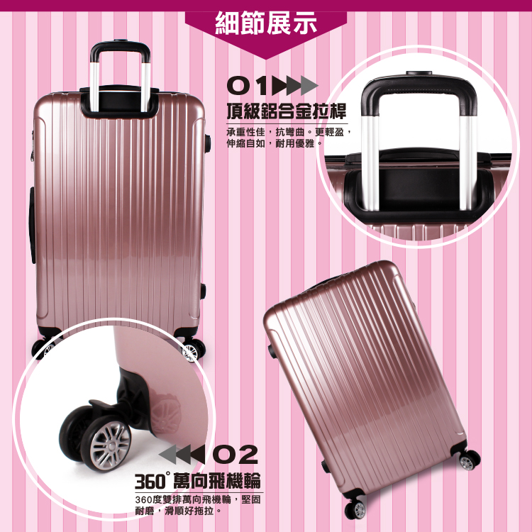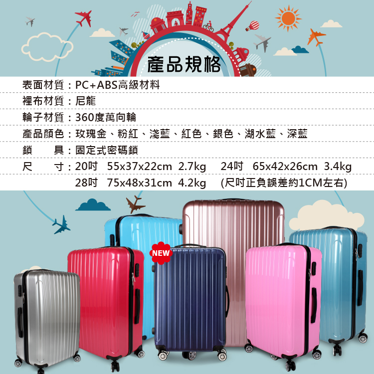商品上有一層膜不是破掉可自行撕開 但建議可以慢點撕有稍微檔刮的功能箱體:約寬42cm;高65cm;深26cm尺寸:24吋空箱:約3.4kg材質:PC+ABS複合式材質配備:固定式安全密碼鎖保固:一年保固維修 (保固不含來回運費 需自行寄回 殼破與拉練內裡壞無保固 )顏色:玫瑰金托運破殼需向航空公司申請破殼證明 以利後續請賠維修 實物顏色更漂亮,以實際商品顏色為準BSMI: R37679型號:SPA-01